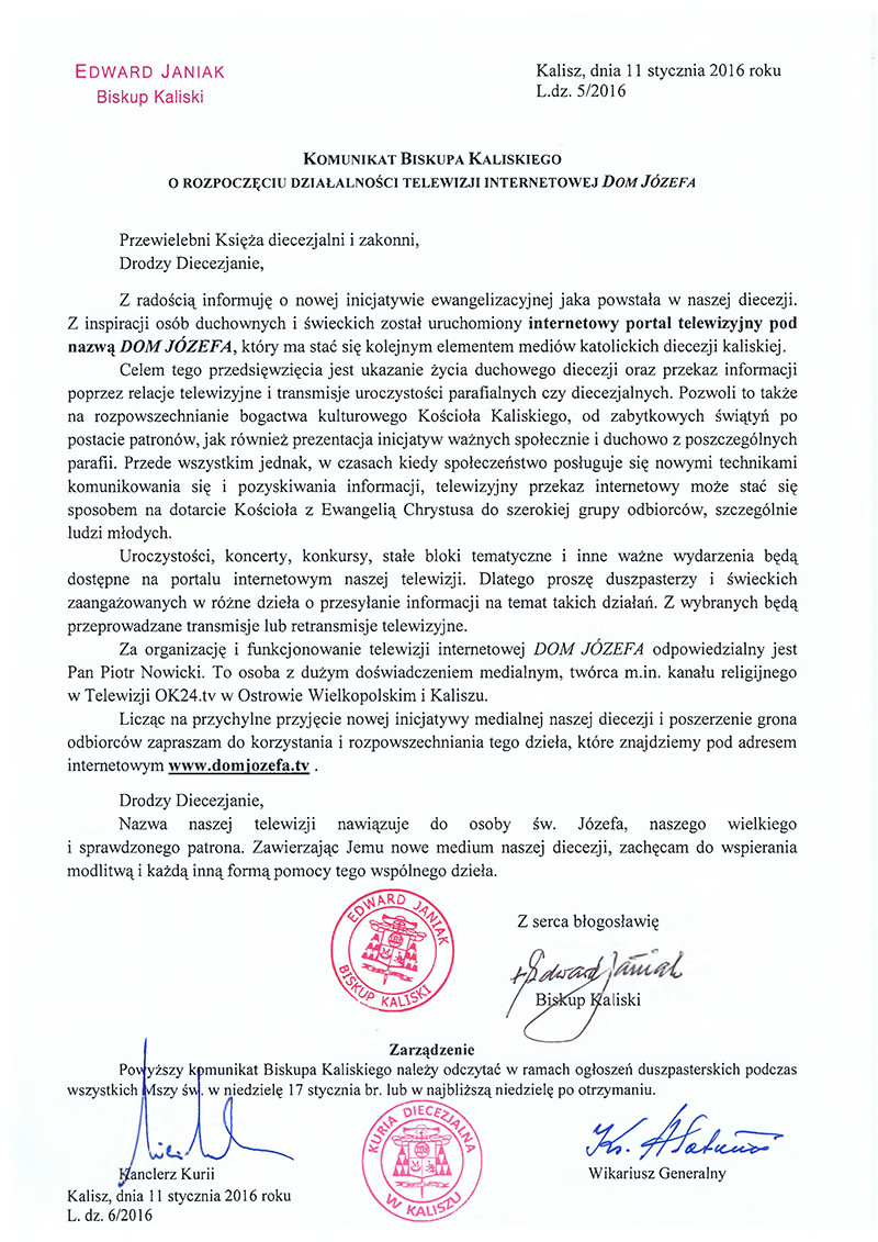 Z całym Kościołem wspominamy chrzest Pana Jezusa, wspominamy także nasz chrzest i dziękujemy Bogu, ale dziękujemy też za Boże dzieła, które się dzieją wokół nas. Przepełnia nas wdzięczność, że dobry Bóg pobłogosławił jednemu z tych dzieł, które powstało w naszej diecezji 10 lat temu - mówił biskup kaliski Damian Bryl podczas mszy św. dziękczynnej za powołanie do istnienia Telewizji Internetowej „Dom Józefa” 11 stycznia 2016 roku. Modlitwa eucharystyczna miała miejsce w Narodowym Sanktuarium św. Józefa w Kaliszu.