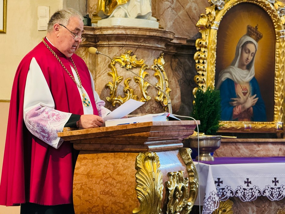 Metropolitę poznańskiego, duchowieństwo i licznie zgromadzonych wiernych powitał biskup kaliski Damian Bryl, który zaprosił do modlitwy we wszystkich sprawach Kościoła Świętego, którego opiekunem jest św. Józef. Prosił o modlitwę o pokój na świecie i zakończenie wszystkich wojen. Przypomniał, że w ubiegłym roku, w uroczystość odpustu św. Józefa, nuncjusz apostolski w Polsce ogłosił nominację biskupa koszalińsko-kołobrzeskiego Zbigniewa Zielińskiego na metropolitę poznańskiego.