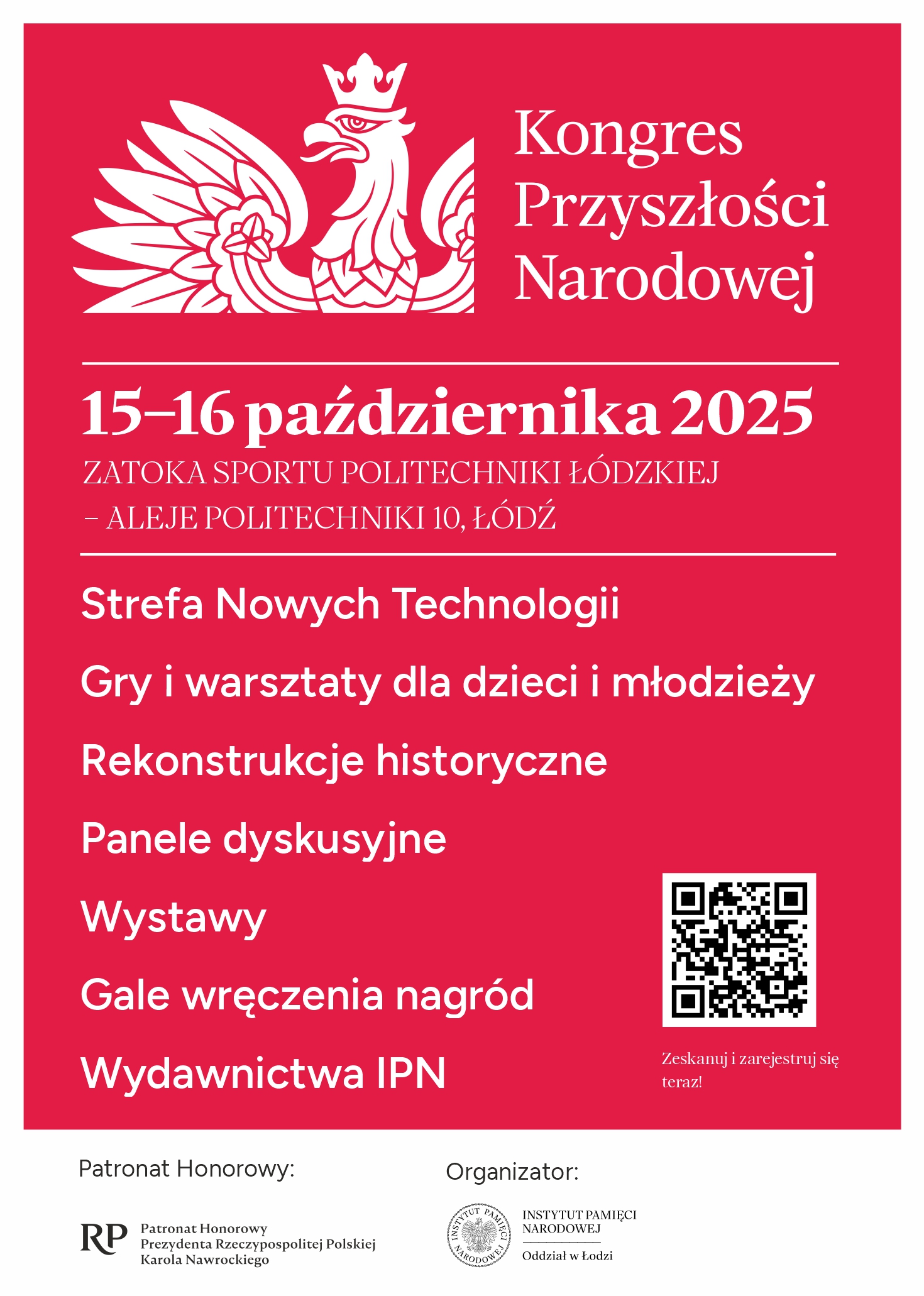 „Historia mówi przez pokolenia” – pod tym hasłem Instytut Pamięci Narodowej Oddział w Łodzi organizuje Kongres Przyszłości Narodowej, który odbędzie się 15–16 października 2025 r. w Zatoce Sportu Politechniki Łódzkiej (Aleja Politechniki 10). Uroczyste otwarcie Kongresu będzie miało miejsce w środę, 15 października br. o godz. 11.00. Wydarzenie zostało objęte Patronatem Honorowym Prezydenta Rzeczypospolitej Polskiej Karola Nawrockiego.