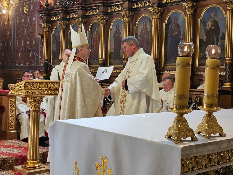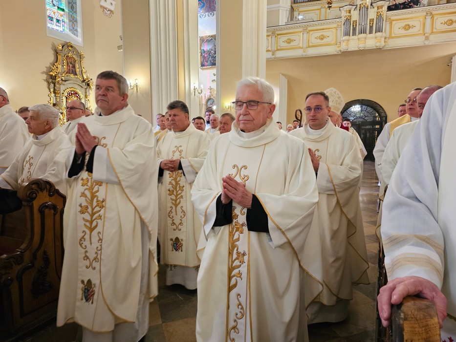 Pozdrowił również księży jubilatów świętujących 70. 60. i 25. rocznicę święceń kapłańskich. Wyraził duchową łączność z kapłanami pracującymi poza granicami kraju.