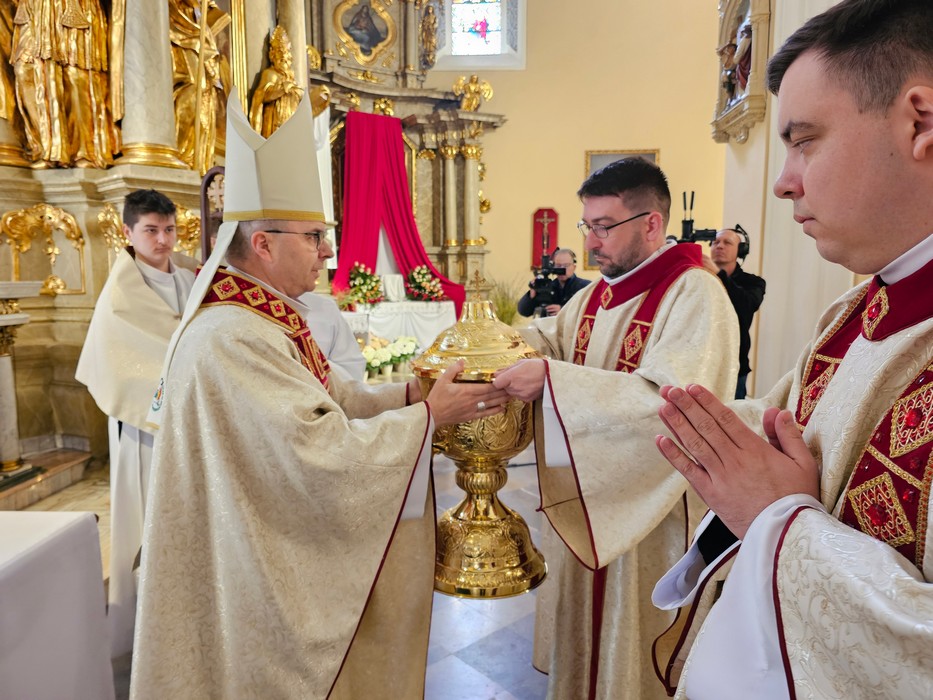 W czasie uroczystej liturgii reprezentanci Zakonu Rycerskiego Świętego Grobu w Jerozolimie przynieśli do ołtarza olej narodowy przywieziony z Ziemi Świętej. Biskup kaliski pobłogosławił krzyżmo oraz oleje chorych.