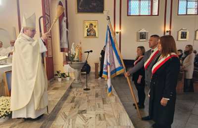 Po homilii biskup Damian Bryl poświęcił sztandar szkoły w Roszkowicach: