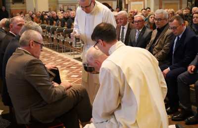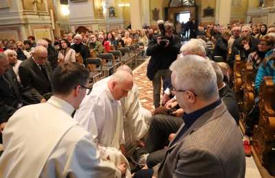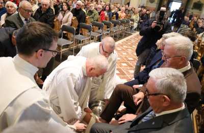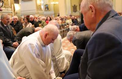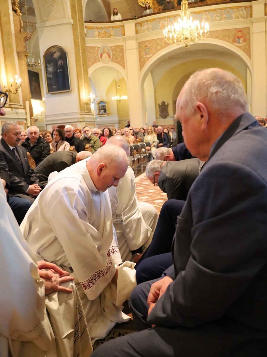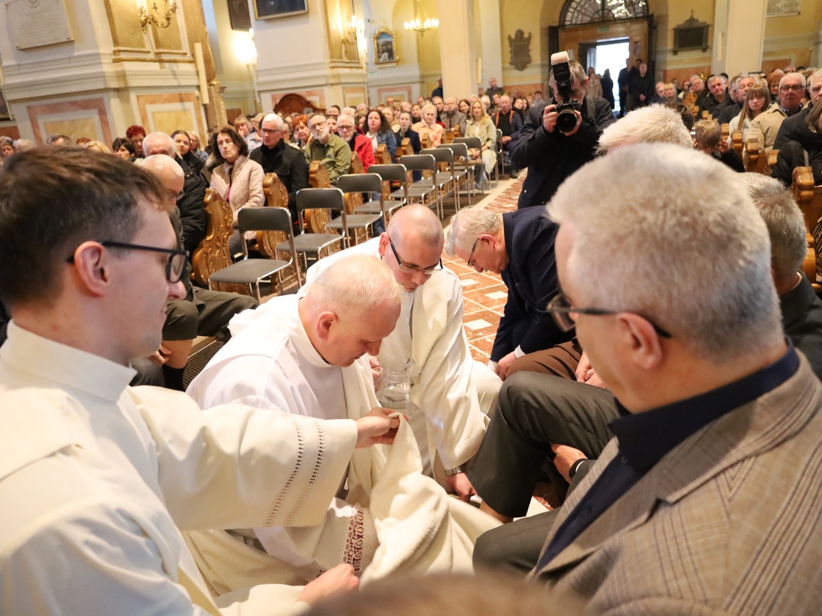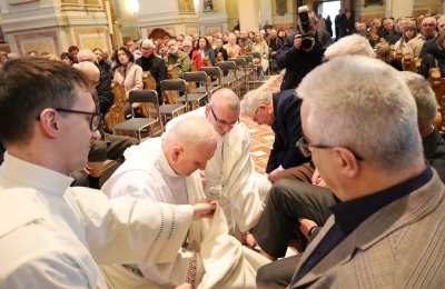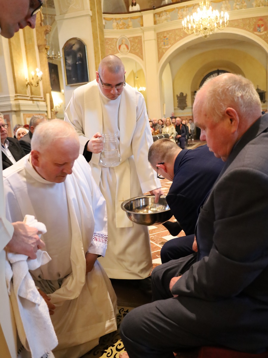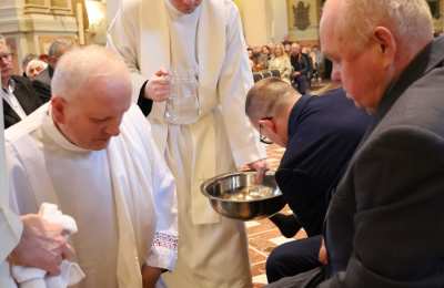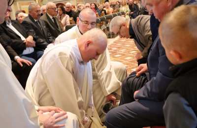 Podczas liturgii Wielkiego Czwartku bp Buzun obmył nogi dwunastu mężczyznom – przedstawicielom parafii.