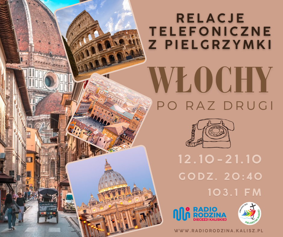 Włochy po raz drugi - pod takim hasłem w dniach od 12 do 21 października odbywa się radiowa pielgrzymka do Włoch w Roku Jubileuszowym. W pielgrzymce uczestniczy 53 pątników. Opiekunem duchowym grupy jest ks. Mateusz Puchała, dyrektor Radia Rodzina Diecezji Kaliskiej, funkcję pilota sprawuje Jarosław Szmigielski, który reprezetnuje Biuro Podróży Orlando Travel.