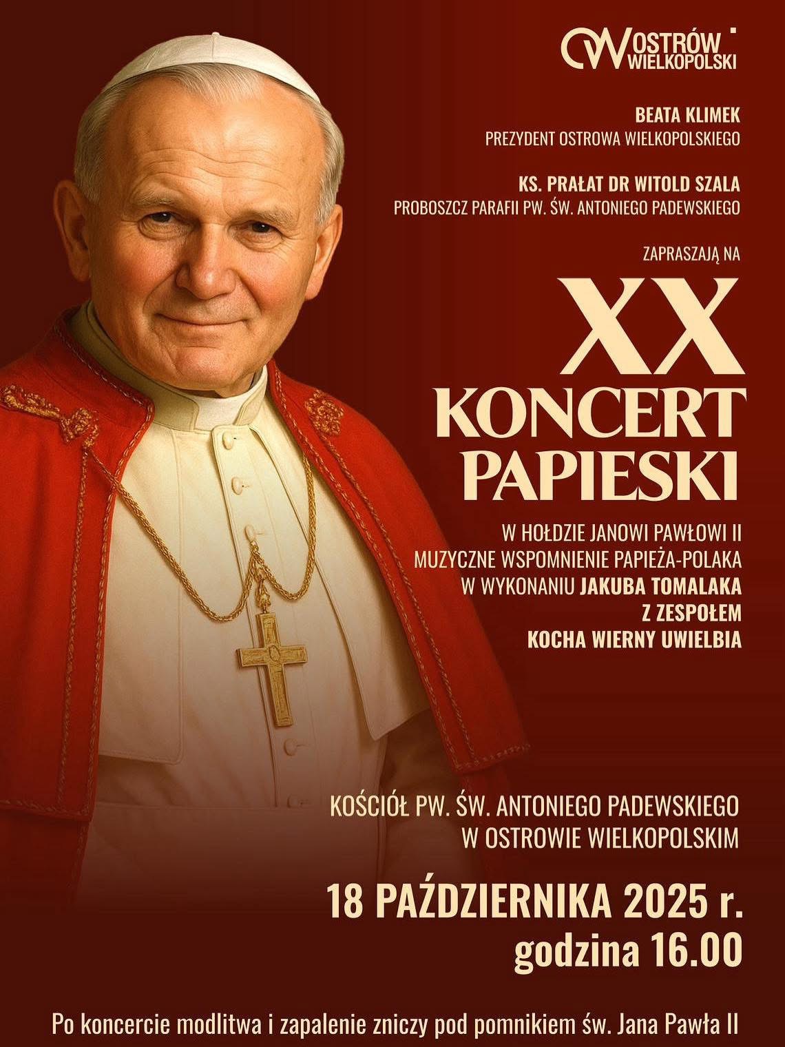 W Ostrowie Wielkopolskim w parafii pw. św. Antoniego Padewskiego zaplanowano XX edycję Koncertu Papieskiego w hołdzie św. Janowi Pawłowi II (Muzyczne wspomnienia Papieża-Polaka) w wykonaniu Jakuba Tomalaka z zespołem Kocha Wierny Uwielbia.